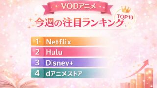 更新:2025/12/282025年のVODアニメ作品の動向を毎週更新で追いかけます。Netflix・Hulu・Disney+・dアニメストア など各サービスの公式ランキングや配信情報をもとに、当サイトが独自に調査・集計した今週の注目作品&...