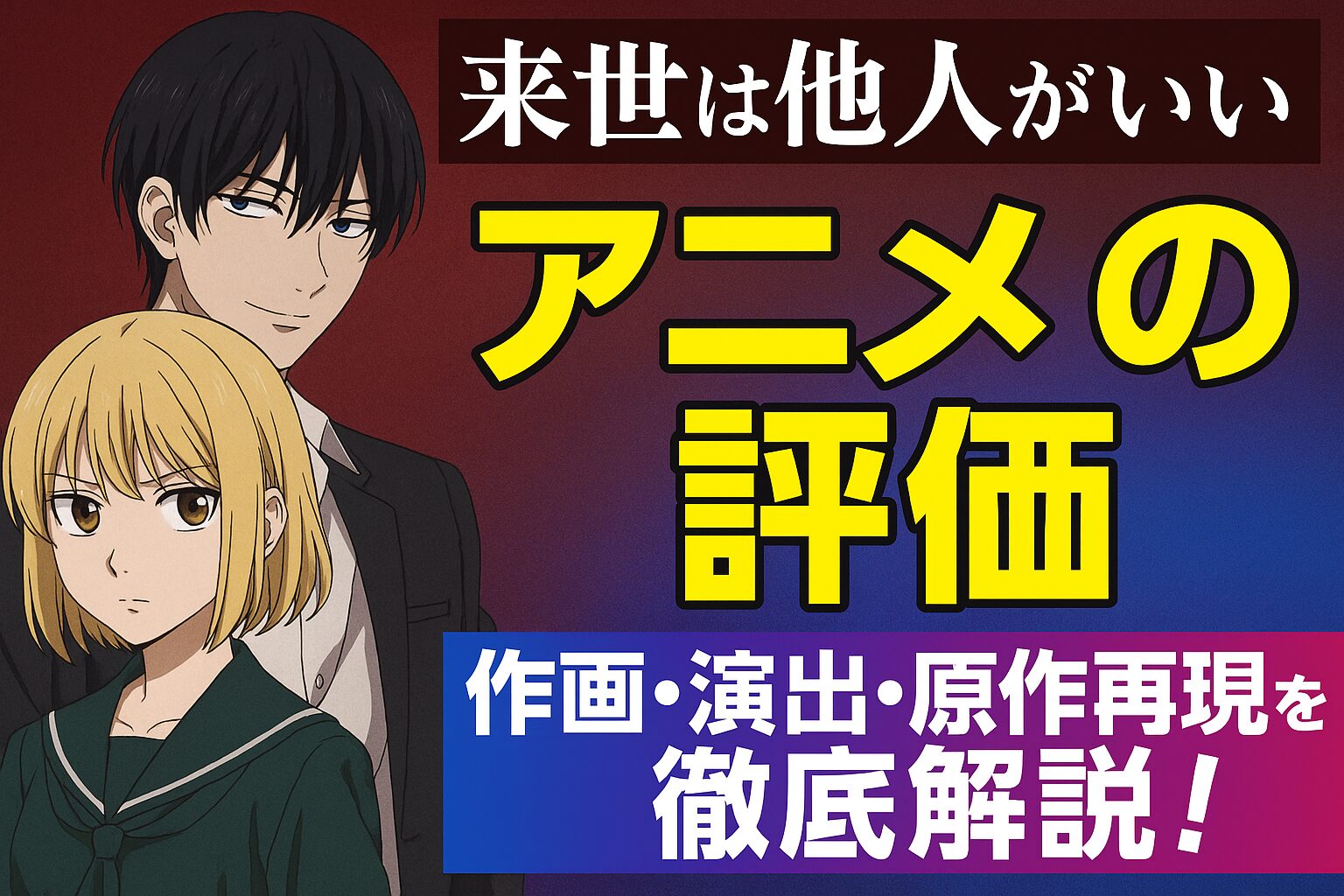 『来世は他人がいい』は、ヤクザの家系に生まれた高校生同士の恋愛を描いた話題のアニメです。